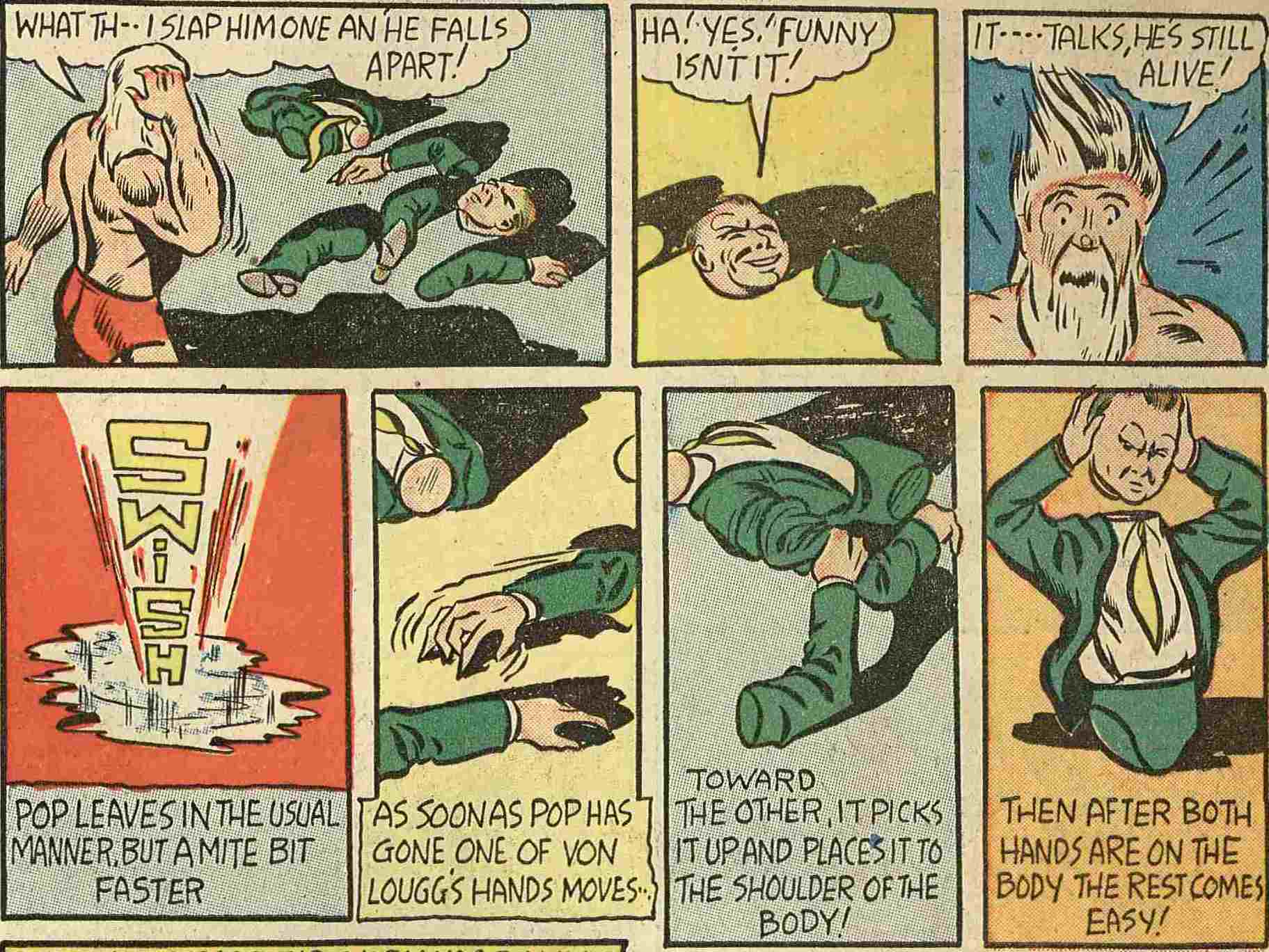 Le conflit mondial se rapprochant, The Shark & Pop affronteront bien entendu toutes sortes de saboteurs et d’agent de la cinquième colonne dont l’un d’entre eux est capable de transformer des hommes en zombies obéissant avec un crane de squelette.